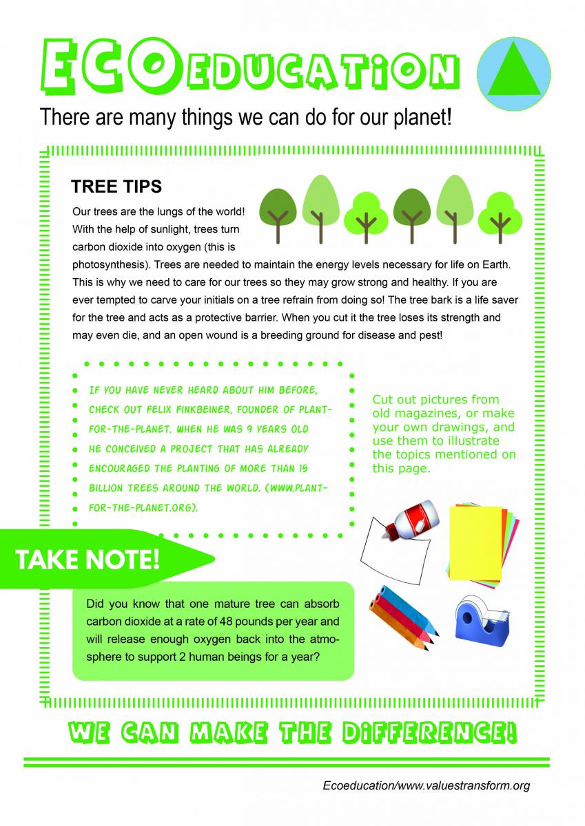 A series of ECO-friendly posters have been developed to support teachers and parents in their endeavour to raise awareness about the urgent need of loving care and actions for our planet. The posters tackle, one by one, simple and practical tips that everyone can follow, to make the difference and help our planet. They are meant to trigger questions and answers, research projects and group discussion, and encourage the children to explore the topics, and sensitize the whole school environmental through their own artwork. You can find them under our resources, or at www.valuestransform.org